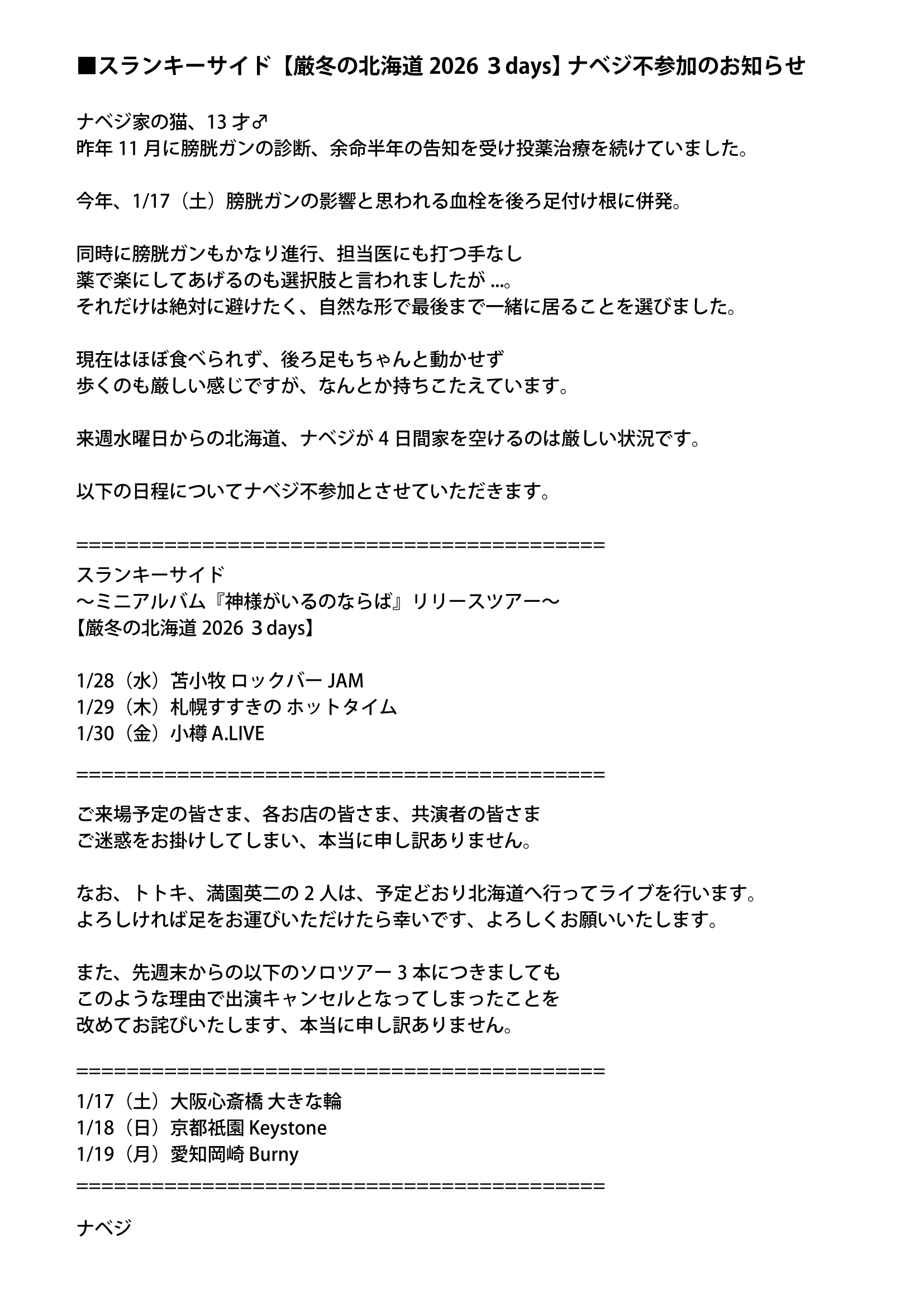 【厳冬の北海道2026 3days】 ナベジ不参加のお知らせ